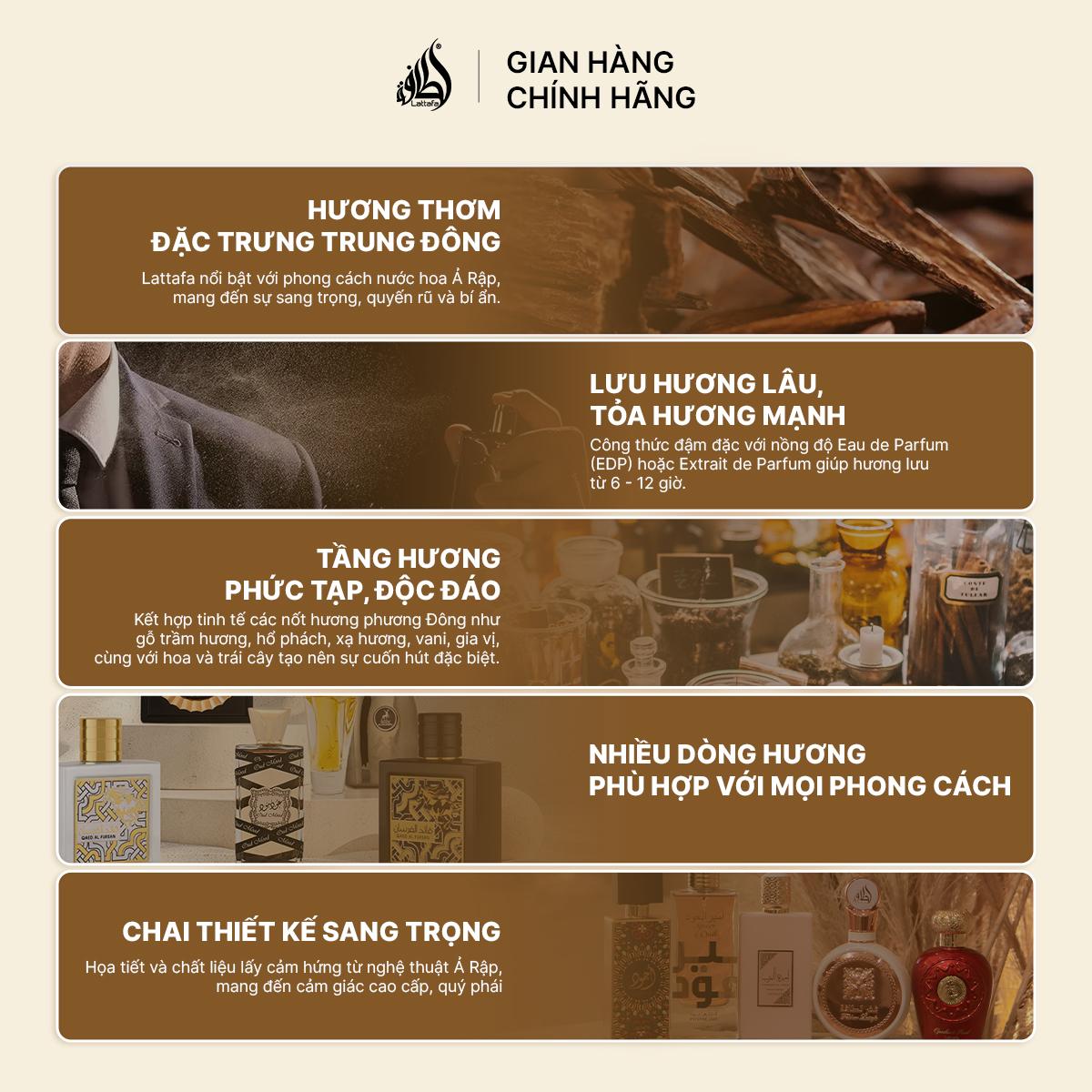 Lattafa là thương hiệu nước hoa cao cấp của Ả Rập, nổi tiếng với những hương thơm độc đáo và sang trọng, phản ánh đậm nét văn hóa Trung Đông. Ra đời từ ý tưởng của ông Sheikh Shahid Ahmad vào năm 1980 và chính thức thành lập công ty vào năm 1992, Lattafa đã vươn xa khỏi biên giới Trung Đông, mang hương thơm quyến rũ đến với khách hàng trên toàn thế giới. Slogan của hãng, ""Indulge The Luxury Of Authentic Arabic Fragrances - Đắm chìm trong hương thơm Ả Rập sang trọng,"" chính là lời mời gọi khám phá những tinh hoa hương thơm đậm chất di sản huy hoàng.